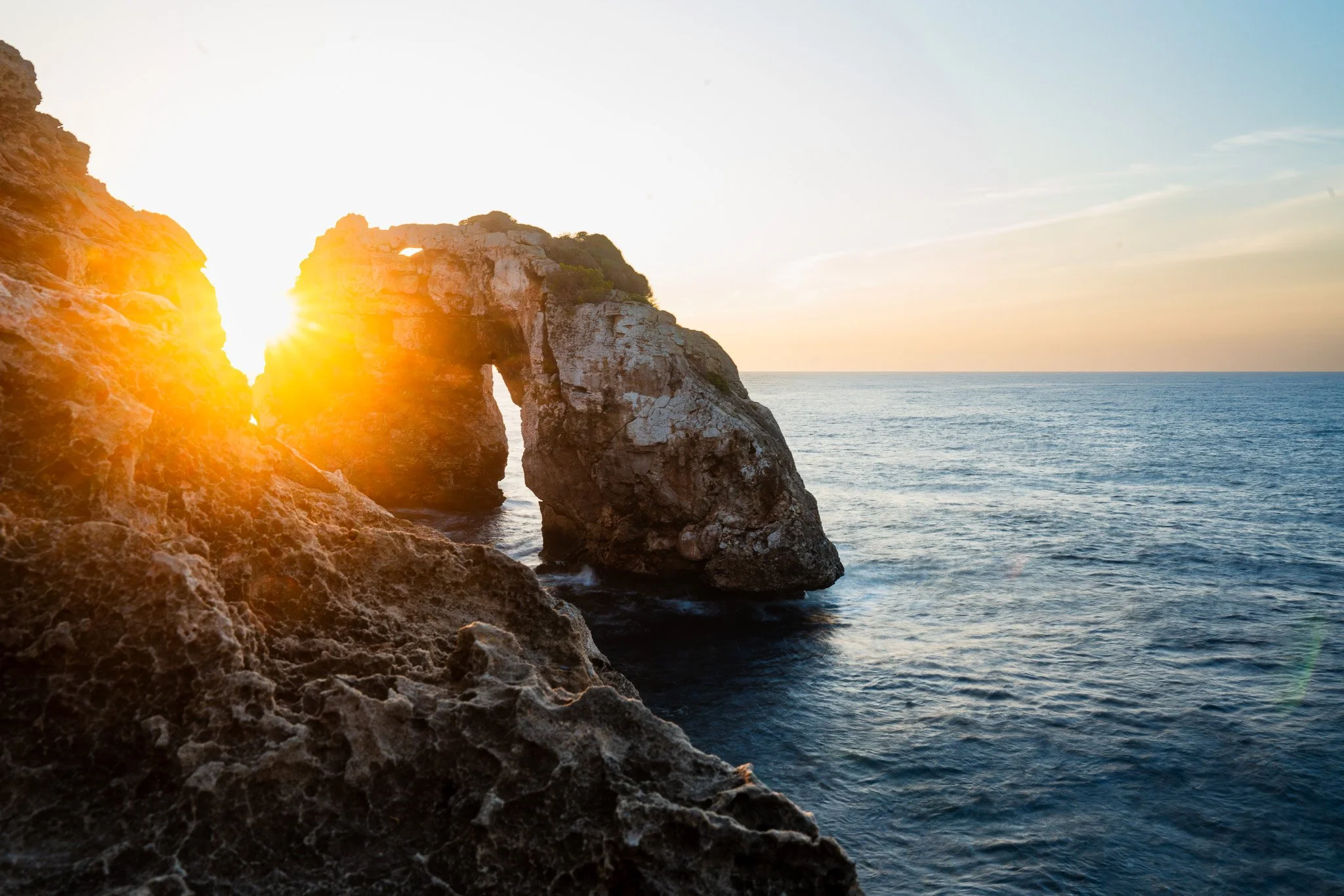 Located on the east coast of Mallorca, this natural rock arch features a large hole carved by the sea, framing the lighthouse in a unique way. As the first light of day spilled through the iconic arch, the sky transformed into beautiful colours.